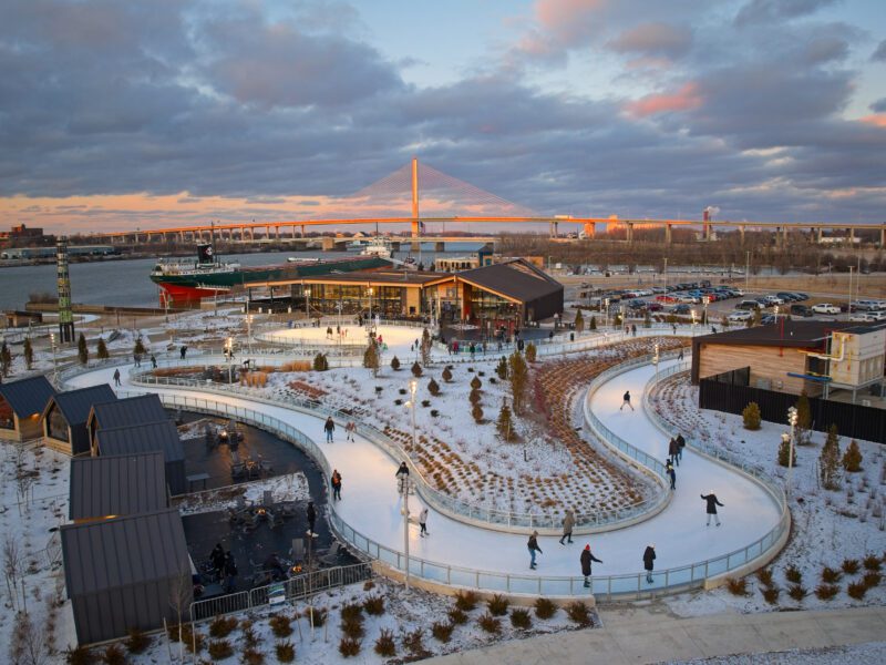 The Glass City River Wall spans over 170,000 square feet on the ADM grain silos along the Maumee River. Designed by artist Gabe Gault and painted by a diverse team using 2,850 gallons of paint, it honors the indigenous heritage of the Great Lakes region, depicting three generations of Native women.