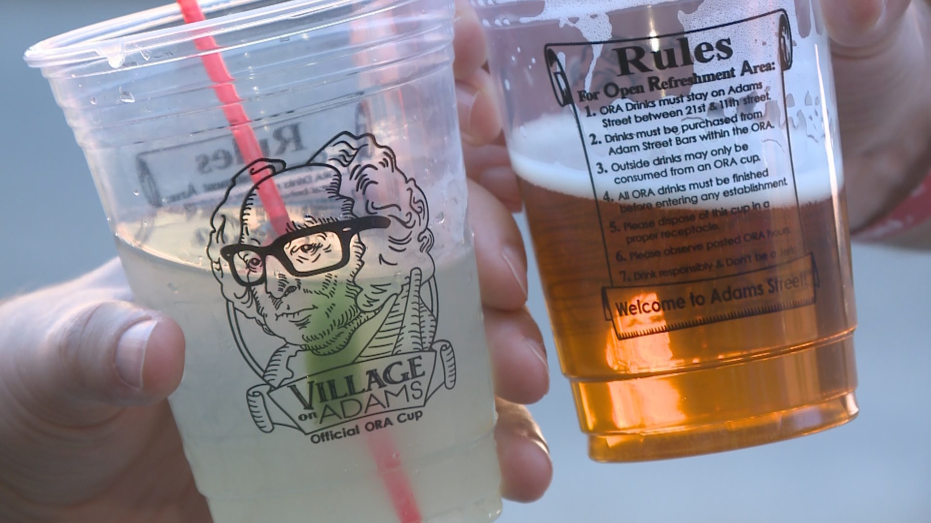 A: You cannot carry a cup between the DORA and Adams St. Outdoor Refreshment Area. Cups must be thrown away at the boundaries of the districts in which they were purchased.