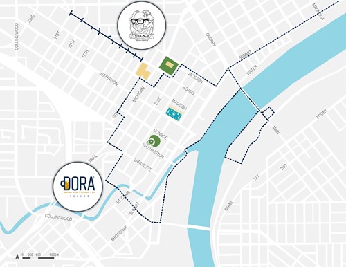 A: Toledo has two Outdoor Refreshment Areas: DORA in the Central, Warehouse District, riverfront and Vistula area and the ORA along Adams Street in the Uptown District. The two do not overlap and operate independently. Refer to the map above. Current Hours are Noon-Midnight daily.