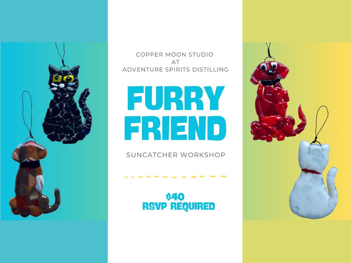 Guests are invited to the production room at Adventure Spirits Distilling on April 26 for an evening of cocktails and fused glass art with Copper Moon Studio. Participants can create a favorite furry companion by choosing between a glass dog or cat suncatcher, perfect for catching the sunlight. This unique, hands-on experience pairs creativity with craft cocktails, offering a memorable night in a distinctive setting. Sign-up is encouraged to secure a spot.